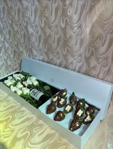 caja elegante rectanfular, incluye 24 rosas, 12 chocolates y vino grande.