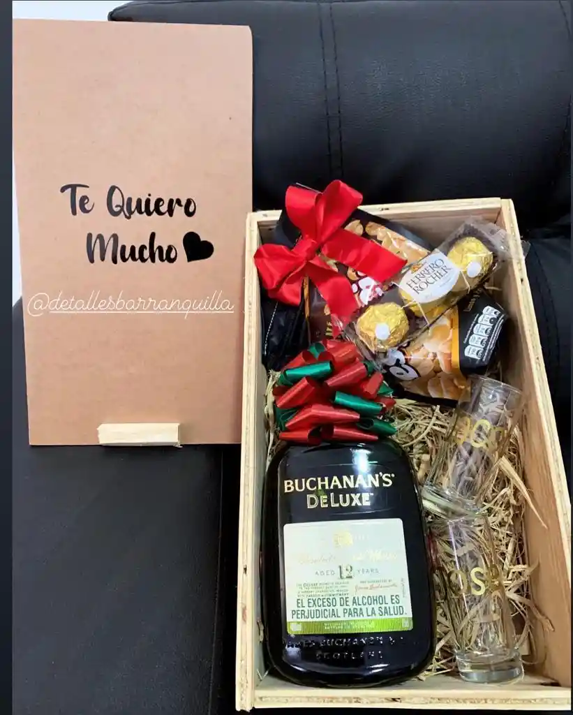 CAJA DE MADERA CON TAPA DESLIZABLE, MENSAJE EN PORTADA, CONTIENE BOTELLA DE BUCHANAN´S DELUXE 750 ML, 2 SHOTS DE VIDRIO, MANI ESPECIAL GRANDE, CHOCOLATE FERRERO X3, TARJETA Y LAZO