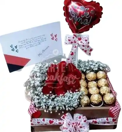 Caja, 12 rosas, 12 ferrero, globo, moño, tarjeta y decoración. Nuestros productos están sujetos a disponibilidad. Para agregar mensaje y remitente, escríbenos al Chat. Te recomendamos programar tu pedido con anticipación, teniendo en cuenta los horarios establecidos.