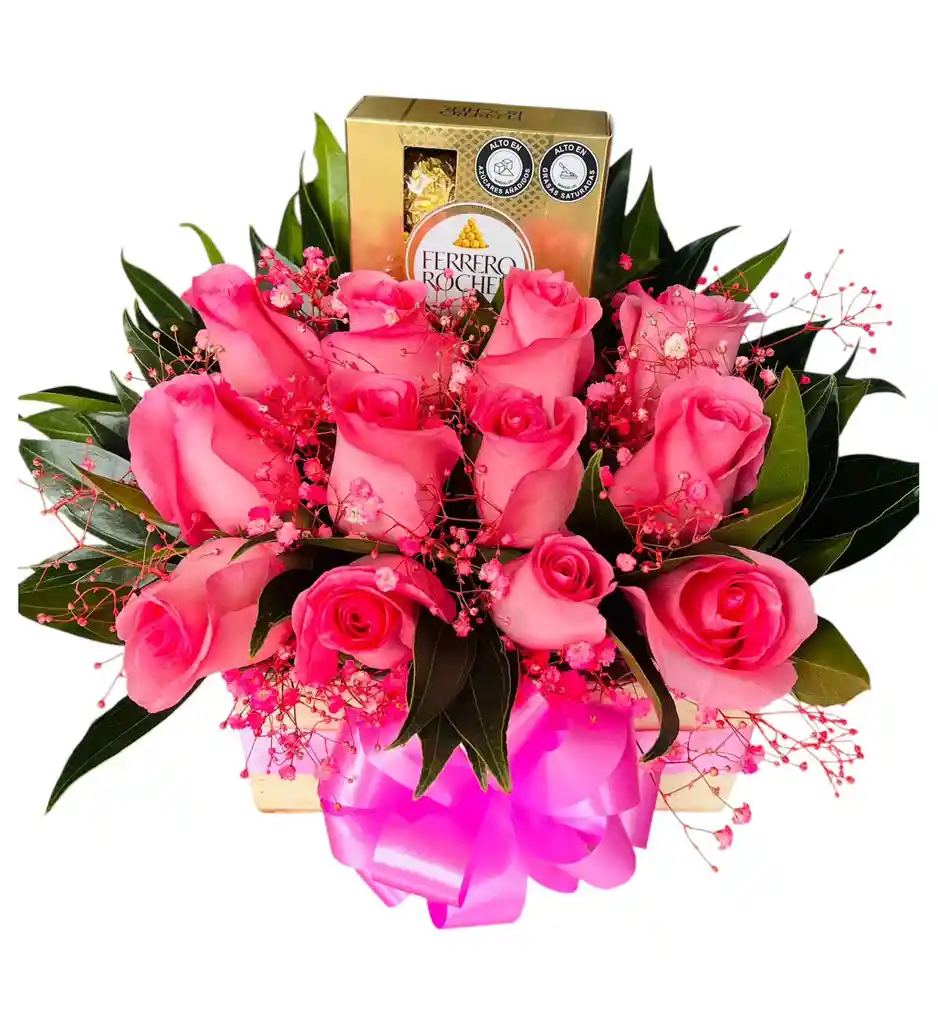 Arreglo floral x12 rosas tipo exportación en tonalidad rosado Chocolates ferrero rocher caja x4 unidades Follaje fino gipsófilia, rusco Moño en satín rosado Diseño elaborado en caja de madera 10x15
