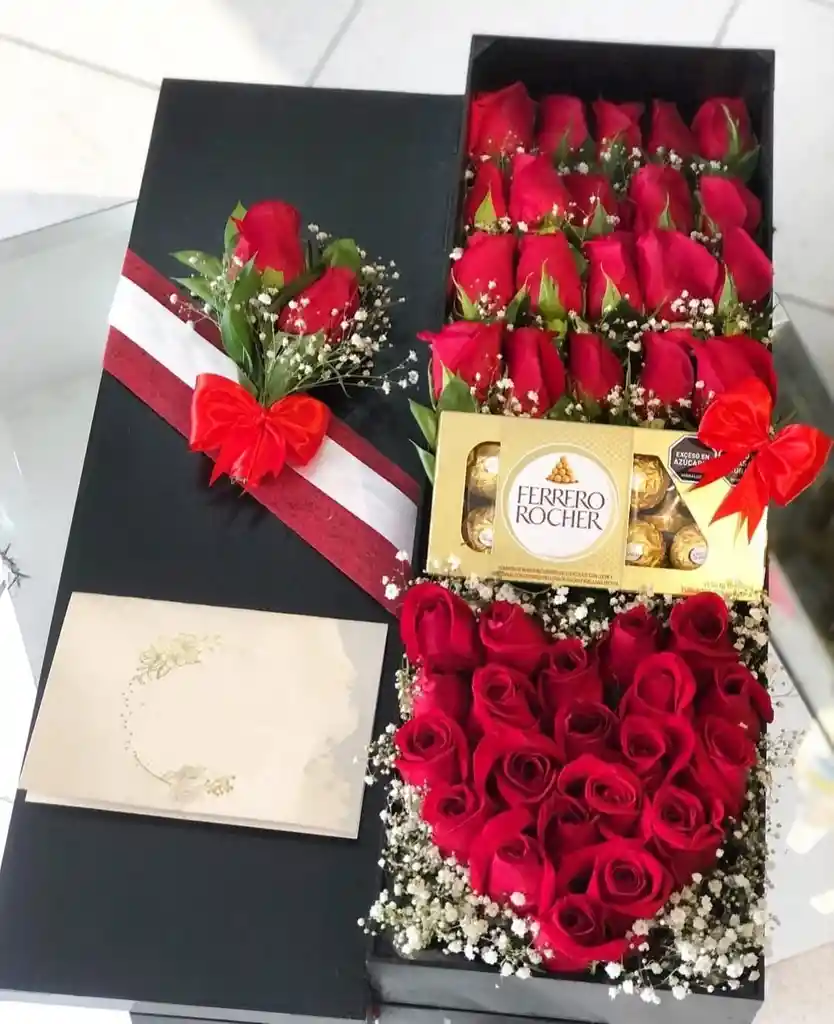 Caja de 48 rosas decoradas en forma lineal y de corazón acompañada de gisofilias, caja de ferrero x 8, tapa de caja decorada con rosas y cinta