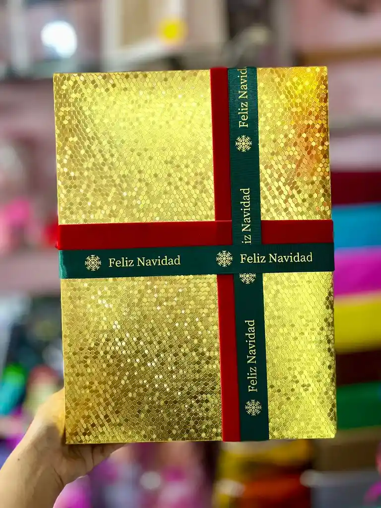 CAJA DORADA GRANDE DECORADA CON CINTAS NAVIDEÑAS