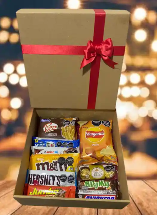 Contenido : Barquillos Pizza Oreo Barra kinder Bueno MM Hershys Jumbo mediana Papas Margarita Milk Way Sniker caja decorada Tarjeta Personalizada