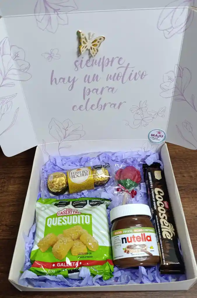 Caja de regalo especial que incluye una selección exquisita de dulces y snacks, ideal para cualquier ocasión . Contiene chocolates Ferrero Rocher, tarro Nutella, galletas Horneadas Quesudito, Cocosette y una paleta de rosa.