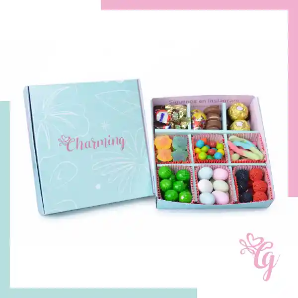 Este regalo en caja con 9 compartimentos, contiene: -4 Snickers o Milky Way mini (Barra de chocolate rellena de turrón y mantequilla de cacahuate, cubierto con caramelo y trozos de cacahuate) ó 2 Mini Gol (Galleta cubierta con sabor a chocolate, caramelo, arroz crujiente y maní) -2 Ferrero Rocher (Bombones de chocolate rellenos de cacao y avellanas) - 4 Labios de Goma (Gomas con suave textura e intenso relleno sabor a fresa) - 3 Montblanc 9gr (Barra de chocolate blanco con almendras) - 6 Almendras Francesas (Almendras grajeadas con azúcar) - 4 Sandías (Chicles con sabor a sandía) - Mix Chocolatero ( Maní, Uvas y Almendras) - 8 Fruit Mix Jahnke (Caramelos frutales premium) - 2 Estrellas de Mar (Gomitas en forma de estrellas de mar sabor a yogurt de fresa)