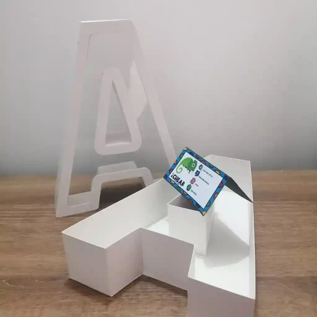 Caja dulcera en forma de letra A, mide 24 CM de largo y 4 CM de profundidad, color blanco, tapa con ventana en acetato. Caja ideal para dulces, fresas con chocolate, gomitas Elaborado en Maule calibre 20.