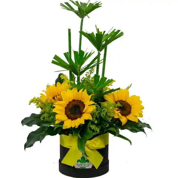 Caja elaborada en 4 girasoles, papiros, manito de Dios, solidaster y lazo de raso amarillo.