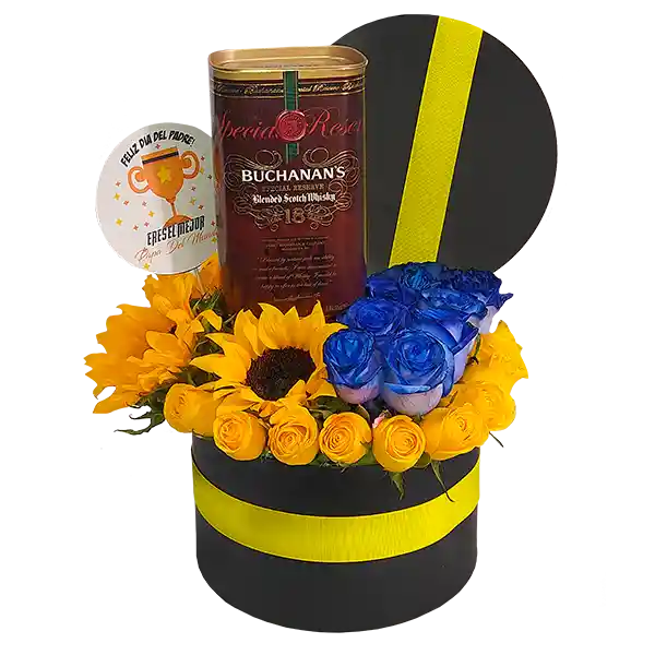 Caja decorada en 12 rosas amarillas, 8 rosas azules, topper, girasoles, botella buchanans