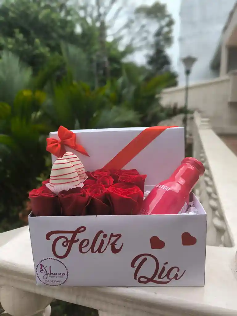 Sorprende con una impactante cajita de rosas acompañado de 2 fresas cubiertas de chocolate blanco + té delicioso