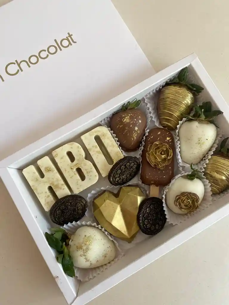 Detalle perfecto para sorprender en su cumpleaños. - Letras en chocolate blanco rellenas (HBD) - 6 fresas cubiertas de chocolate blanco y/o negro - Corazón de diamante en chocolate negro relleno - Paleta de chocolate negro rellana Rellenos: - Arequipe - Maní - Crema de avellanas - Galleta triturada Incluye: - Bolsa de regalo - Tarjeta