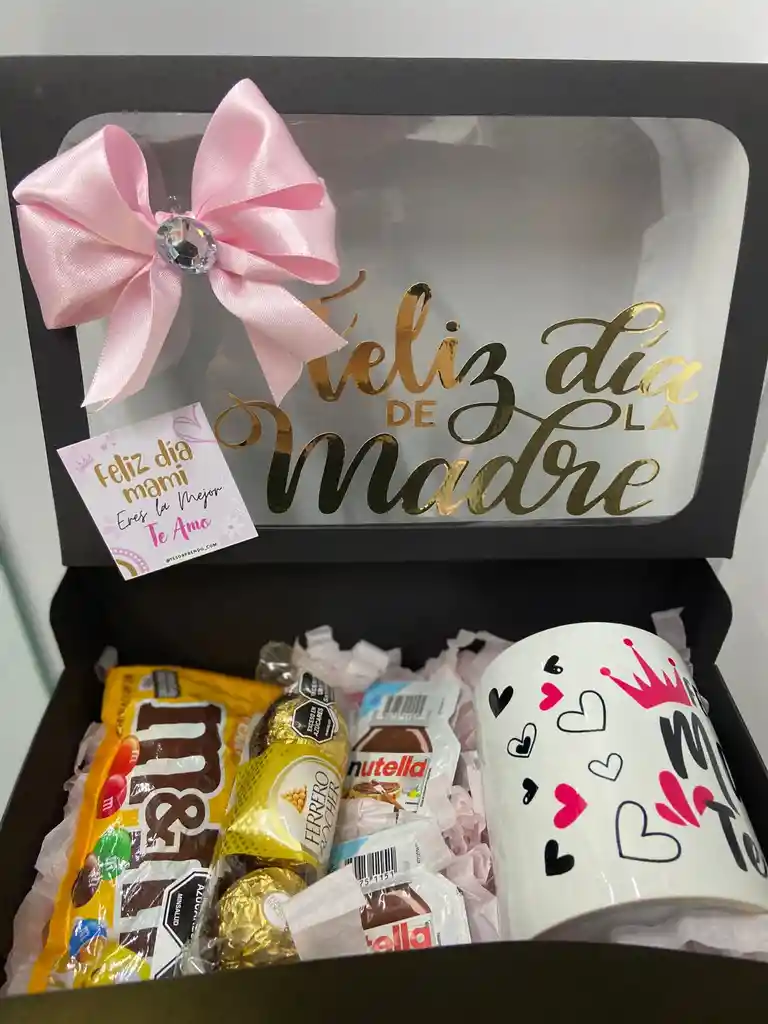 Una sorpresa pensada para consentir a mamá en su día. Incluye una hermosa taza con diseño alusivo al Día de la Madre (el modelo puede variar según disponibilidad, pero todas son con temática especial), un paquete de MM's, una presentación de 3 bombones Ferrero Rocher y dos mini Nutella. Todo empacado con delicadeza en una caja elegante decorada con moño y mensaje en vinilo dorado. Ideal para decirle cuánto la amas con un detalle dulce y significativo.