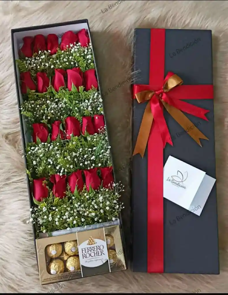 arreglo de rosas en caja de lujo, acompañado de chocolates ferrero x 8 unds, con follajes de temporada, decorada con cinta y moño; incluye tarjeta con mensaje que puedes personalizar