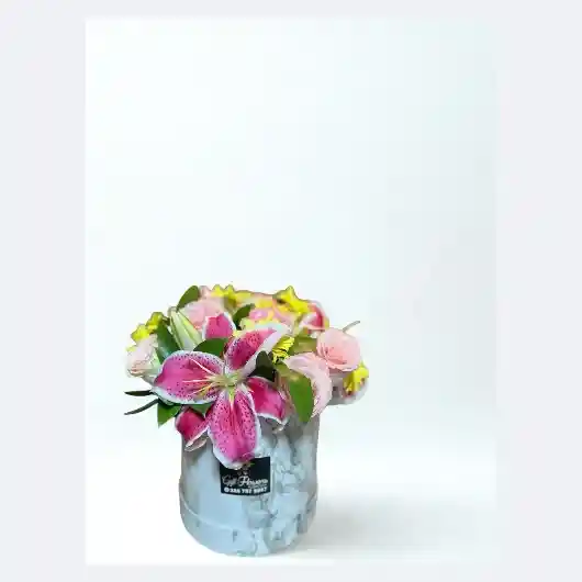 Cilindro marmolizado acompañpado de 8 rosas rosadas con solidago y dos hermosos lirios japoneses