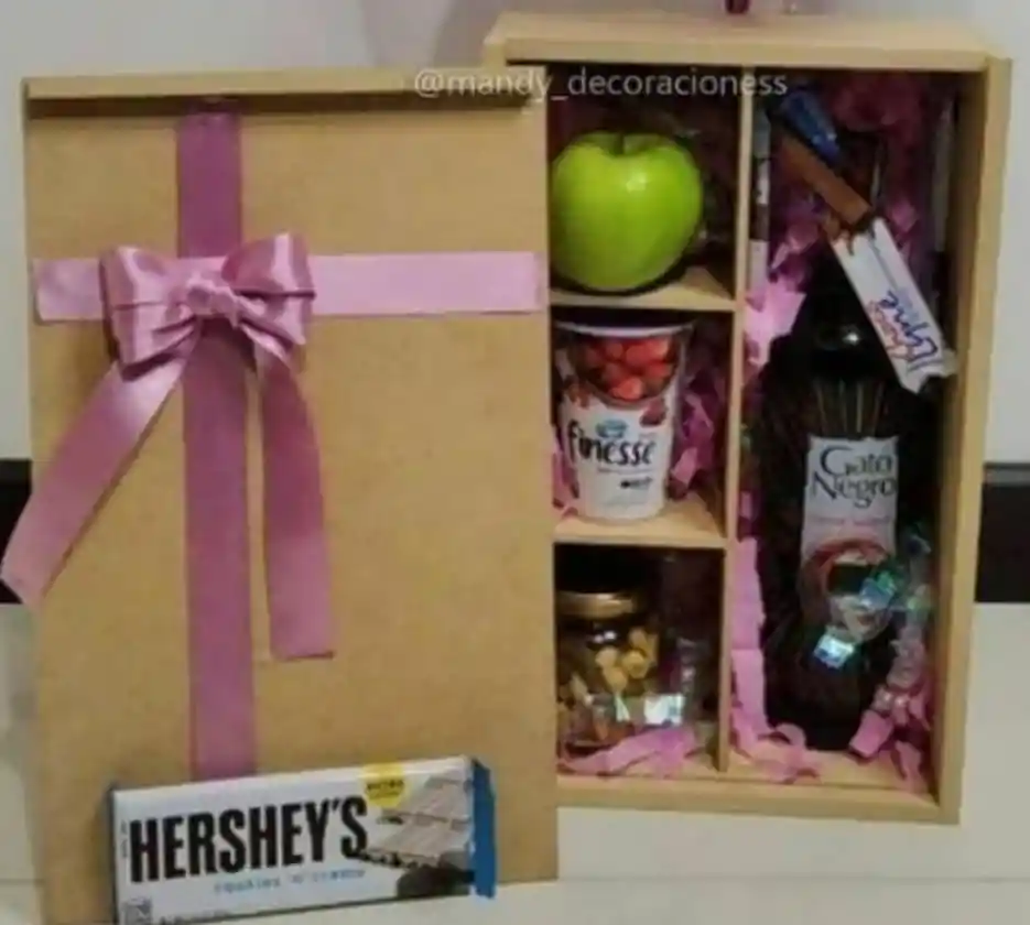 Arreglo con botella de vino, mani, fruta, chocolate y bebida