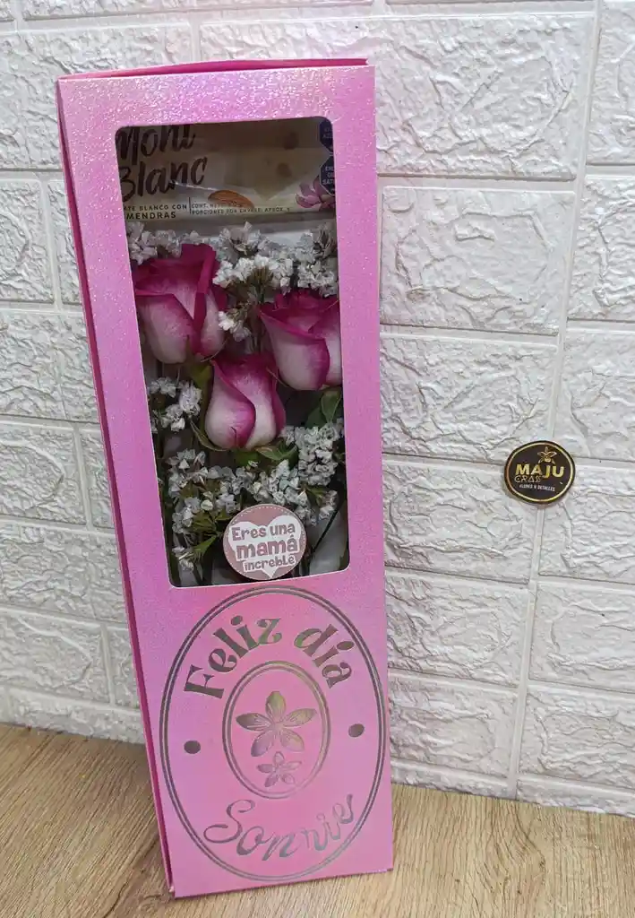Caja decorativa con tres rosa y chocolatina mont blanc (colores según disponibilidad de la tienda).
