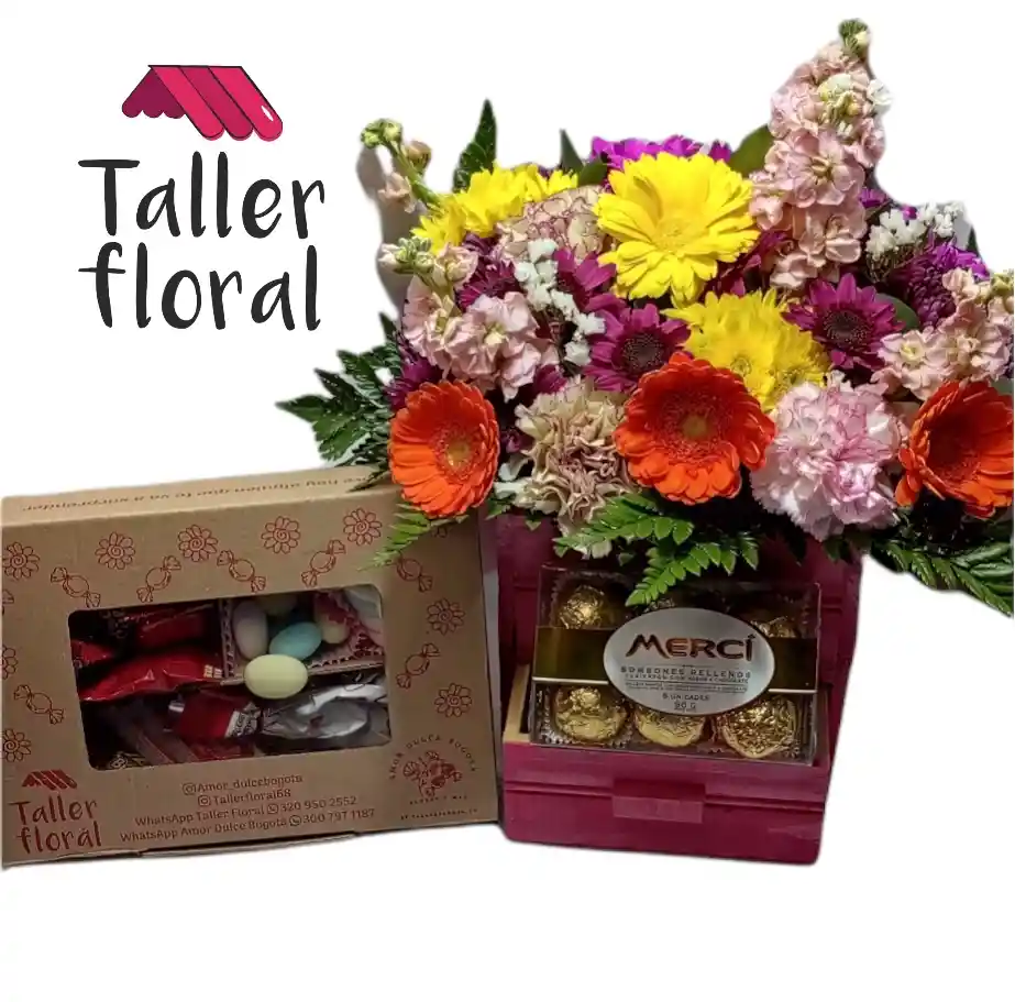 Hermosa caja chocolatera con flores de temporada acompañada de una hermosa caja amor dulce y disfruta de nuestra variedad en gomitas marshmallows Almendras y mucho más