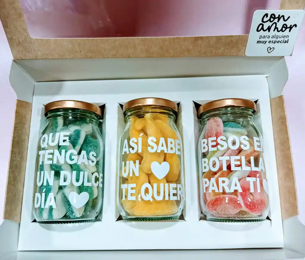 CAja de regalo con frasquitos llenos de dulces gomitas y mucho amor, ideal para sorprender a los que amas de una manera muy especial, endulza tu vida!!!! Ideal amor y amistad, endulzadas, San Valentín, Día de la Mujer, flores amarillas, amigo secreto, cumpleaños ,