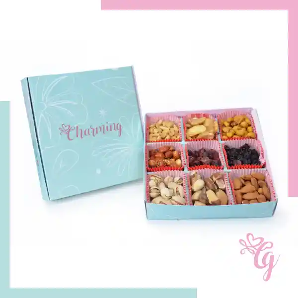 Eset regalo en caja con 9 compartimentos, contiene: - 40gr Maní Salado - 30gr Habas Tostadas - 30gr Maíz Tostado - 40gr Maní Dulce - 40gr Uvas Pasas - 40gr Arándanos Secos - 30gr Pistachos - 40gr Nueces - 40gr Almendra Natural