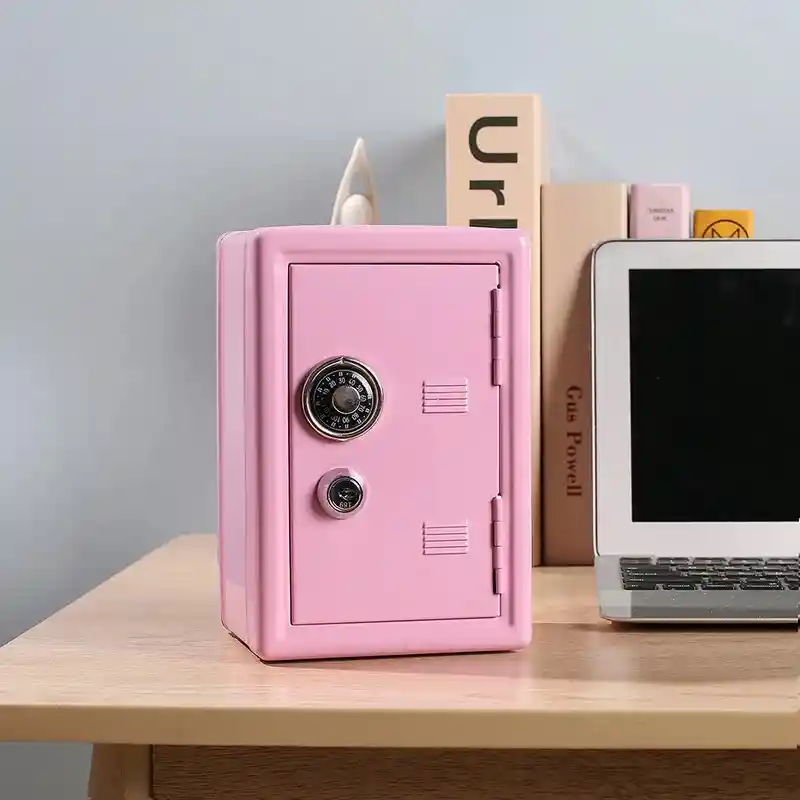 Mantenga todos sus objetos de valor a salvo y ahorre de manera segura. Colores disponibles: rojo, negro, rosado Material: Hierro Tamaño: aprox. 18cm x 10cm x 12cm / 4.72" x 3.94" x 7.09'' / Peso: 518g. Contiene: una caja fuerte tipo alcancía, una bandeja organizadora y 2 llaves de seguridad.