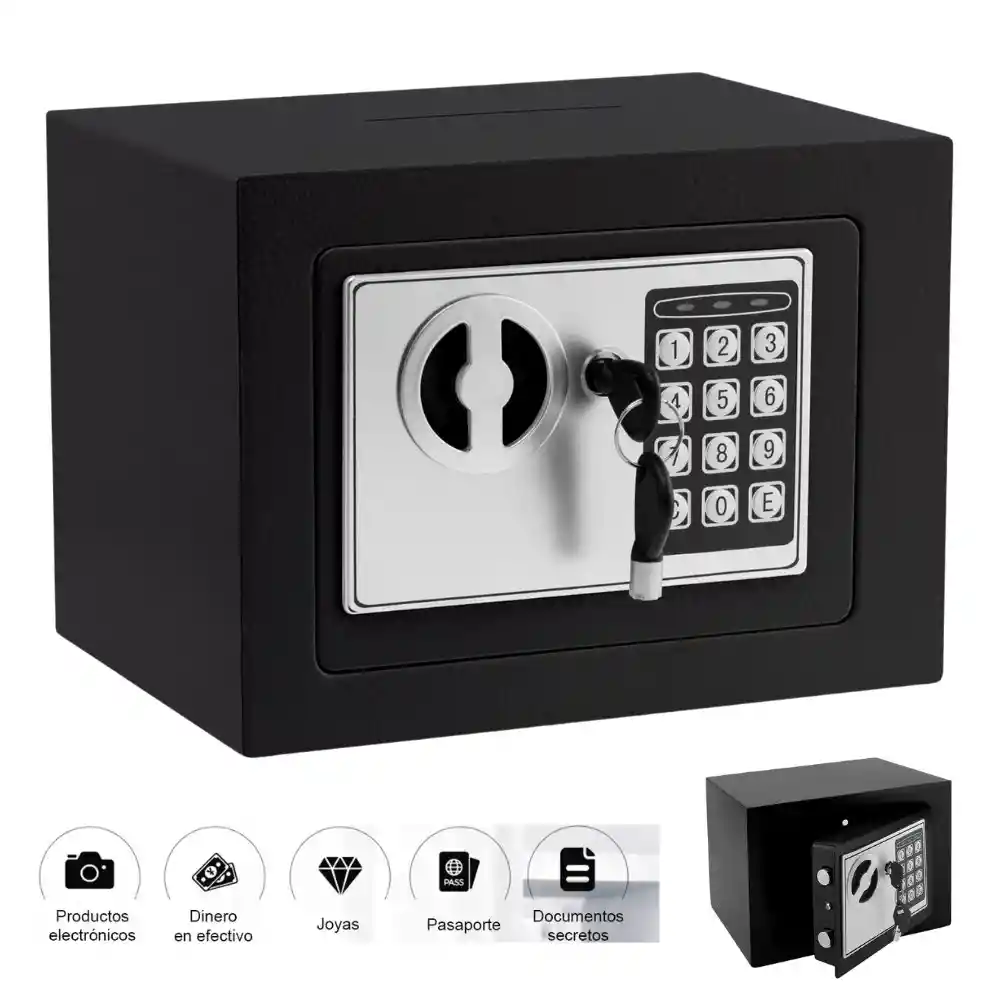 Garantiza la seguridad de tus bienes más preciados con nuestra Caja Fuerte de Seguridad Electrónica Compacta. Diseñada para ofrecer tranquilidad y protección confiable, esta caja fuerte es la solución perfecta para guardar joyas, dinero en efectivo, documentos importantes, medicinas o cualquier artículo de valor tanto en tu hogar como en la oficina. Características Destacadas para tu Seguridad y Tranquilidad: Tamaño Compacto y Discreto: Con unas dimensiones de 23 x 17 x 17 (ancho x largo x alto) Cerradura Electrónica de Alta Seguridad: Accede a tus pertenencias de forma rápida y segura mediante un código personal. Doble Sistema de Acceso para Mayor Tranquilidad: Además de la cerradura electrónica, incluye 2 llaves de anulación de emergencia. Esto te protege en caso de olvidar tu código de acceso o si las baterías se agotan. Fácil de Montar y Asegurar: Incluye 2 pernos de expansión para que puedas montarla de forma segura y permanente en la pared, el suelo o un estante, añadiendo una capa extra de seguridad contra la extracción no autorizada. Alimentación Práctica: Funciona con (4) pilas AA (no incluidas), lo que permite su instalación en cualquier lugar sin depender de tomas de corriente cercanas.