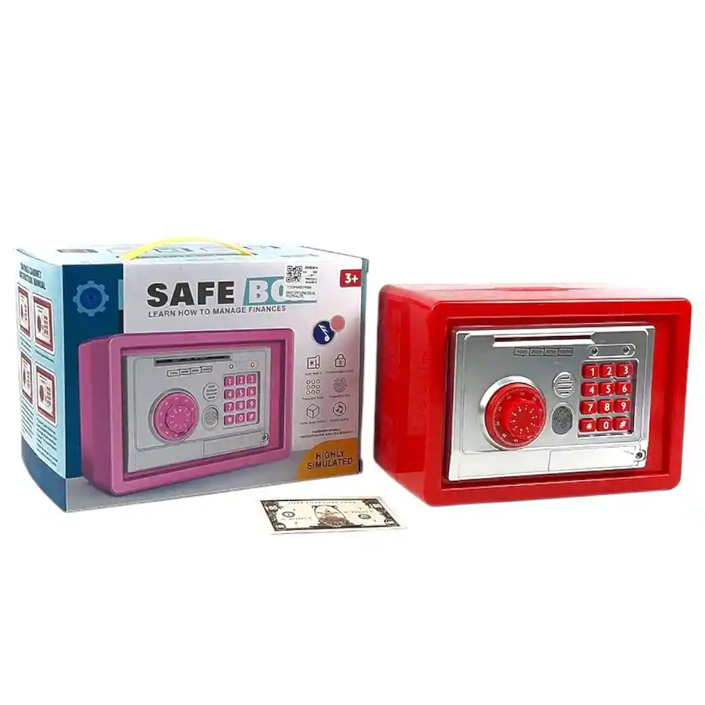 Es una alcancía con diseño de caja fuerte infantil. Funcionalidades: Incluye mecanismo de giro automático para billetes, protección por contraseña y luces musicales. Seguridad: Cuenta con doble protección mediante contraseña para mayor seguridad y una ranura para monedas. Capacidad: Ofrece un espacio extra grande para almacenar efectivo y objetos pequeños. Uso: Diseñada para niños mayores de 3 años como herramienta educativa para aprender a gestionar finanzas y ahorrar dinero.