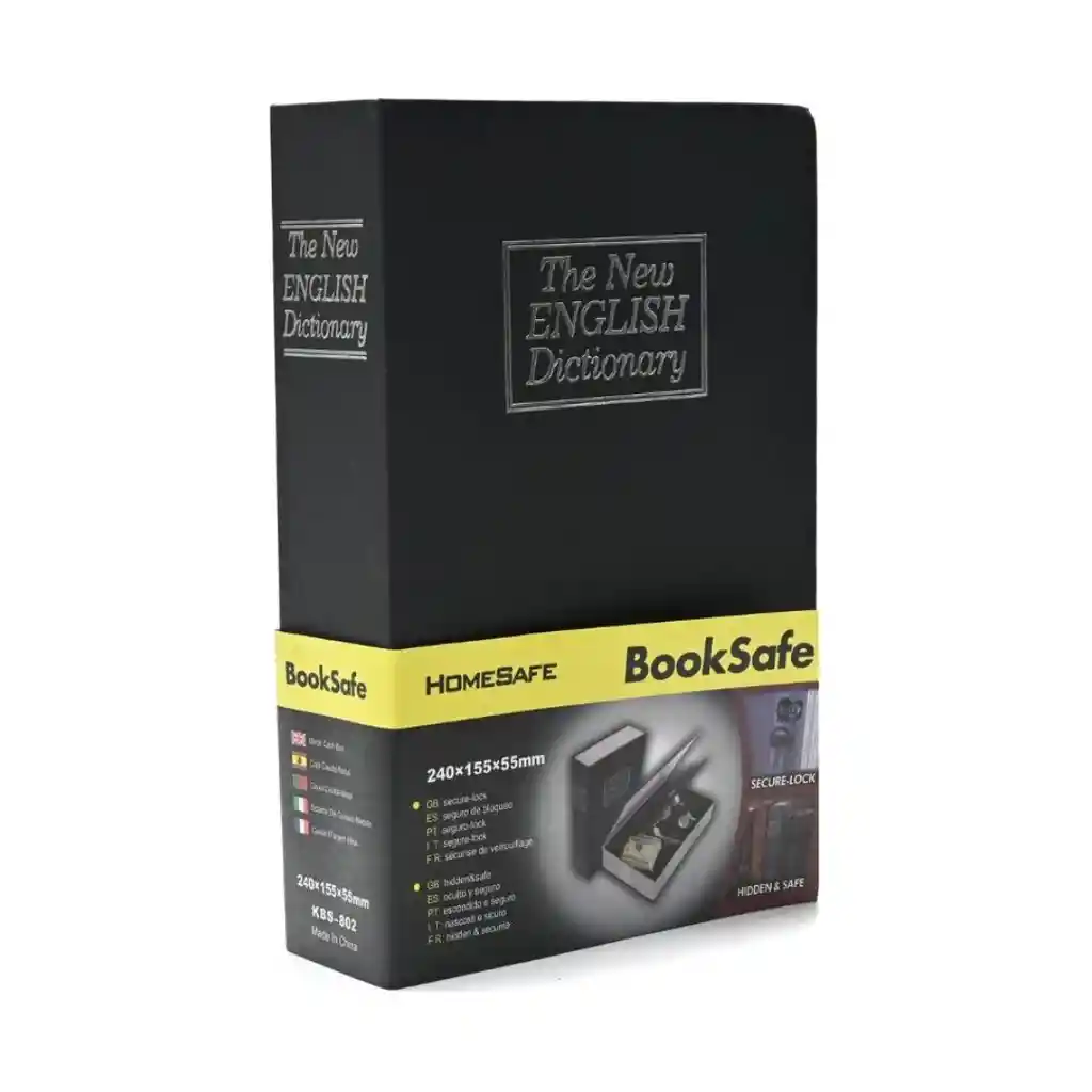 Caja Fuerte Simulada Libro - Alta Capacidad y Seguridad Discreta Protege tus objetos valiosos con la Caja Fuerte Simulada Libro, una solución ingeniosa para mantener tus pertenencias seguras y fuera de la vista. Con un diseño en color azul y negro camuflaje perfecto, este libro falso se integra fácilmente en cualquier estantería o mueble junto a otros libros. En el frente y el lomo, el grabado en inglés "The New English Dictionary" añade un toque de autenticidad. Fabricada con un resistente cofre de metal, esta caja fuerte ofrece una alta capacidad de almacenamiento y una tapa dura forrada que garantiza durabilidad y discreción. Además, cuenta con un sistema de bloqueo con llave, proporcionando seguridad adicional. Fácil de transportar y de ocultar, es la elección ideal para quienes buscan combinar estilo y protección en su hogar u oficina.