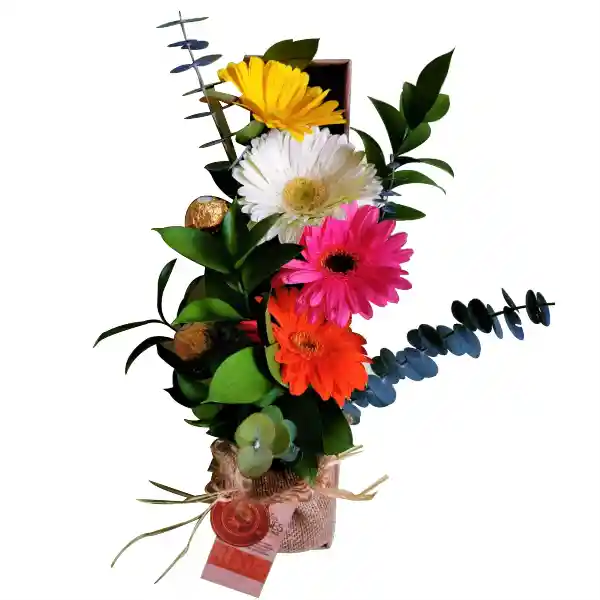 Caja con 4 gerberas en colores surtidos, follajes y 2 ferrerros. El color de la flor sera según disponibilidad en tienda