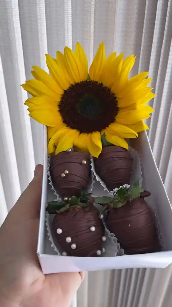 Caja Girasol,contiene un girasol y cuatro fresas bañadas en chocolate.