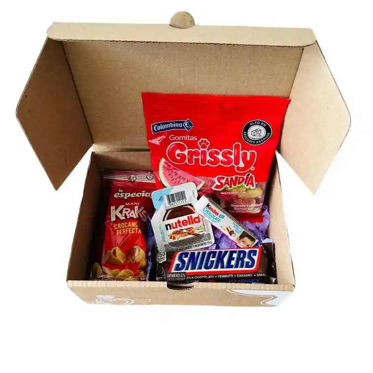 CAJA GOMITAS Y DULCES Incluye: 1 Gomitas Grissly 80g (Variada segun disponibilidad) 1 Mani Kraks La Especial 25g 1 Chocolatina Snickers Barra 52,7gr 1 Barra Chocolate Kinder 12.5g 1 Nutella Individual 15g Caja cuadrada pequeña impresa (HAPPY DAY) 18x13x7 Papel picado, moño y tarjeta (DE-PARA). La caja se envia en una bolsa de papel sellada. NOTA: Si deseas incluir tarjeta impresa a color escribir en "COMENTARIO AL SHOPPER"