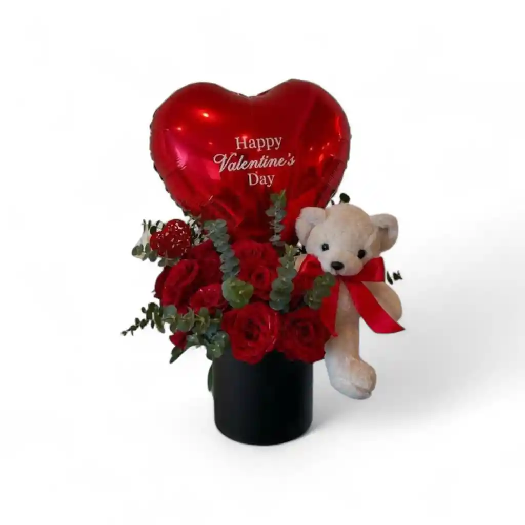 Caja con 24 rosas follajes aromatizados, acompañada de peluche y globo incluye tarjeta