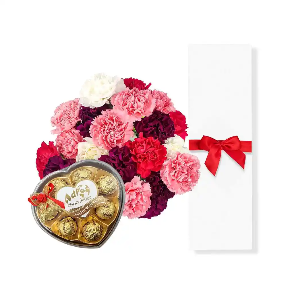 Caja de chocolates en forma de corazon en 8 unidades y ramo de claveles naturales de 24 unidades con caja de carton reciclable