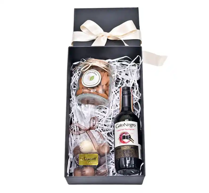 -Bot. Vino Tinto Gato Negro 187ml. -Fco. Almendras o variedad de frutos secos. -Bol. Trufas gourmet Nayarith x5 unidades.