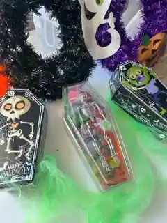 caja de acrilico con diseño halloween con gomitas chocolate hershey , dulces variados