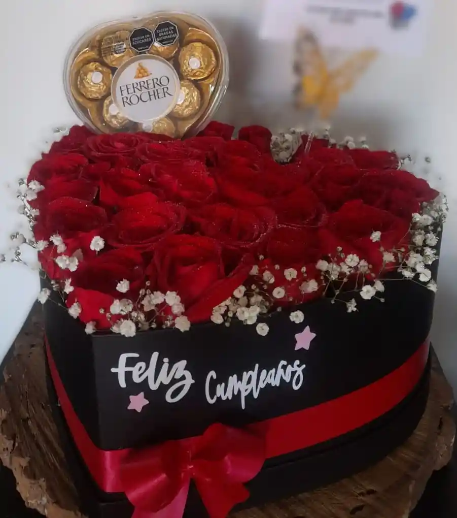 caja en forma de corazòn elaborada con rosas y acompañada con ferrero en forma de corazòn