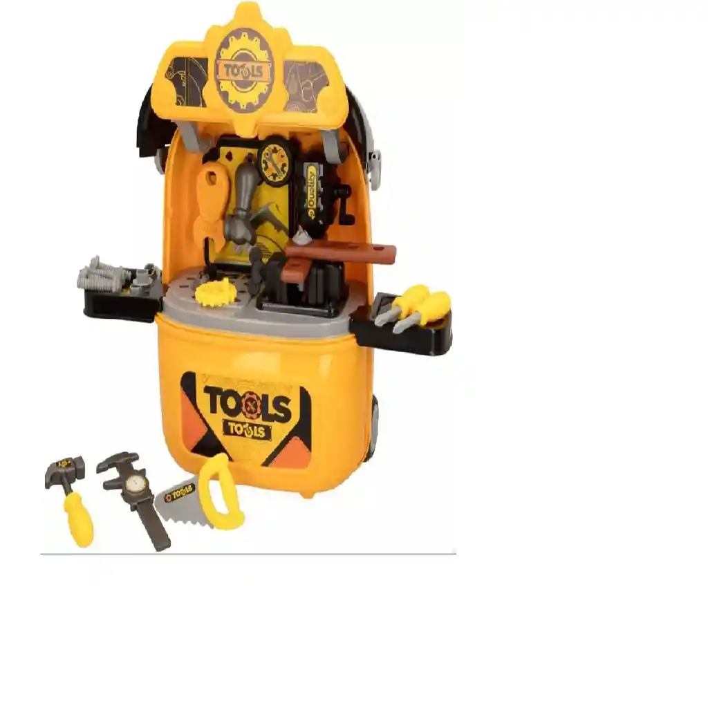 La imagen muestra un maletín de herramientas de juguete para niños. Este tipo de juguete está diseñado para que los niños puedan jugar a ser carpinteros o mecánicos.