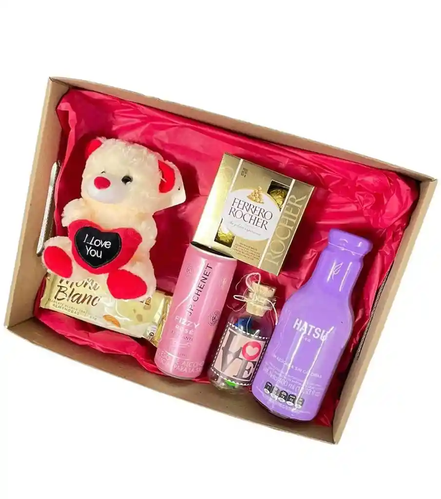 Caja decorativa que contiene: Peluche pequeño, JP en lata, Bebida de Hatsu, Chocolatina Mont Blanc y Chocolates MM en frasco decorativo