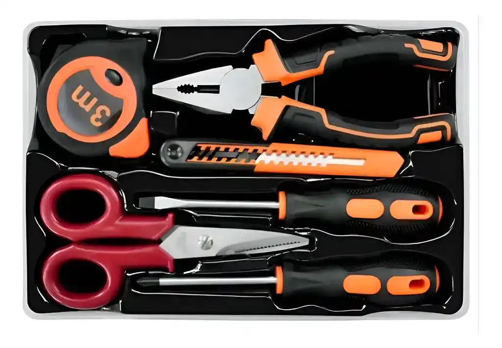 Este juego de Herramientas está diseñado para quienes buscan calidad y funcionalidad en un solo paquete. Ideal tanto para profesionales como para aficionados al bricolaje, este set incluye las herramientas esenciales para realizar reparaciones en el hogar, oficina o cualquier lugar donde se necesite una solución rápida y eficiente. - Alta Calidad: Fabricadas con acero de alta resistencia (45 Acero), las herramientas aseguran durabilidad y rendimiento. - Ligero y Portátil: Con un peso total de 0.6KG y dimensiones de 24 x 16,5 x 3,1 cm, es fácil de transportar y almacenar. - Versatilidad: Perfecto para una amplia gama de tareas, desde medir hasta cortar y atornillar. - Organización: Mantén todas tus herramientas en un solo lugar y bien organizadas gracias a su práctica caja. ESPECIFICACIONES: - 1 Cinta Métrica de 3 Metros: Precisa y fácil de usar, ideal para medir con exactitud. - 1 Alicate de Cable (6 pulgadas) : Perfecto para cortes y ajustes de cables y alambres. - 2 Destornilladores (3 pulgadas) : Incluye destornilladores de punta plana y estrella para diversas aplicaciones. - 1 Bisturí: Herramienta precisa para cortar y detallar en tus proyectos de manualidades o bricolaje. - 1 Tijeras: Robusta y afilada, perfecta para cortes precisos.