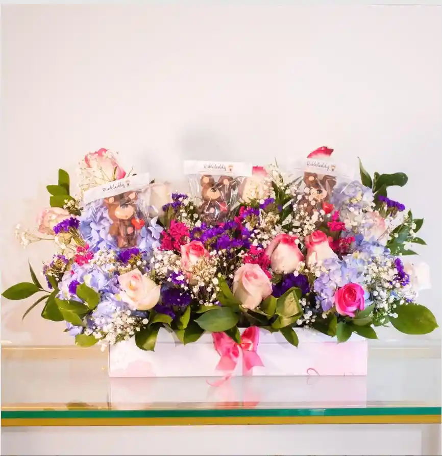 Una sorpresa que llena de sabor y aroma a quien la recibe, no solo por su belleza, sino por su delicioso sabor, los rosas pasteles con su aroma natural, las fresas con su fresco sabor y el dulce del chocolate. Esta combinación conecta los sentidos con las emociones y en el corazón surgirá el cariño por quien ha regalado tan inolvidable detalle. Es ideal para una quinceañera, o una conquista tierna y sutil. Contiene: Caja deluxe con 4 Chocoteddys (ositos de chocolate con relleno de arequipe) 12 Rosas colores surtidos o unicolor (color sujeto a disponibilidad) Decoración con follajes rojos y verdes. Kit de globos en helio por 2 unidades. Tarjeta GRATIS.