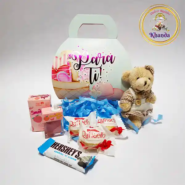 Caja Khanda Choco Bolsito de Ternura, contiene: 1 Chocolate Hersheys Cookies and Cream Snack Size x 12gr (Chocolate Hersheys Mini x 12gr, Chocolate Blanco con Galletas y Crema.) - 3 Chocolate Raffaello (Son Chocolates Crujientes especialidad de Wafer y Coco con relleno cremoso y almendra entera.) - 1 Brillo Labial Cremoso Smoothie Lips (Brillo Labial Cremoso de la Marca Trendy) - 1 Peluches Pequeños Tipo Llavero (Peluche Pequeño de Felpa)