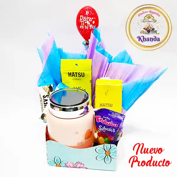 Caja Khanda Chocogomas Mug Especial, contiene: 1 Mug de Tapa Tipo Espejo (Taza Tipo Mug con Tapa Diseño Espejo Color Variado) - 1 Hatsu Té Surtido Tetrapack x 200ml (Hatsu Té en presentación Tetrapack x 200ml, diferentes sabores que pueden ser: Té Blanco y Mangostino, Té Amarillo con Carambolo y Flor de Loto, Té Azul con Granada y Mora Azul o Té Lila con Flor de Cerezo.) - 1 Hatsu Snacks Maní con Sabor Natural a Limón y Sal (Maní tostado con sabor natural a limón y sal. ) - 2 Chocolate Hershey's Cookies and Cream Snack Size x 12gr (Chocolate Hershey's Mini x 12gr, Chocolate Blanco con Galletas y Crema.) - 1 Gomas Paquete Trululu Sabores x 35gr (Gomas con Recubrimiento Confitado Sabor Frutal)