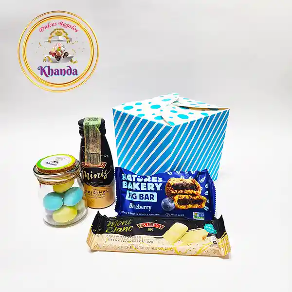 Caja Khanda Cubo de Amor - Hombre, contiene: 1 Crema De Whisky Baileys Minis x 100ml (Crema de Licor x200ml basada en Whisky Irlandés y crema de leche, con esencia de cacao y vainilla.) - 1 Barra de Chocolate Mont Blanc Baileys Edición Especial (Barra de Chocolate Blanco con Relleno Sabor Crema Irlandesa y Almendras.) - 1 Paquete de Galletas Fig Bar Nature's Bakery (Barra de Higo y Trigo entero con relleno de Frambuesa.) - 1 Frasco de Vidrio Pequeño Tapa Corcho relleno de 7 Almendras Francesas Cubiertas Diferentes Colores y Sabores (Almendra Tostada Recubierta de Jarabe de Azúcar de Colores Surtidos.) - Caja Tipo Cubo de Color Azul.