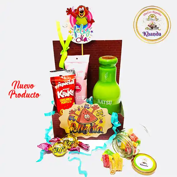 Caja Khanda Happy Day, contiene: 1 Hatsu Té Surtido Botella Vidrio x 400ml (Hatsu Té en presentación Botella x 400ml, diferentes sabores que pueden ser: Té Amarillo con Carambolo y Flor de Loto, Té Azul con Granada y Mora Azul, Té Verde con Yusu y Manzanilla o Té Lila con Flor de Cerezo.) - 1 Hatsu Snacks Maní con Sal del Himalaya x 40gr (Maní tostado cuidadosamente con sal rosada del Himalaya.) - 1 Maní Kraks Paquete x 25gr (Maní Recubierto y Horneado.) - 2 Burbujas Jet (Burbujas Jet, son deliciosos bombones con cubierta de chocolate Jet y rellena de arequipe.) - 17 Gomitas Trululu Ladrillos (Gomas Sabor Frutal Manzana, Cereza y Lima.) - 1 Pin Pequeño Redondo Mensajes Variado (FR) (Pines Pequeños Redondos de Regalo con Mensajes Variados Por Unidad.)