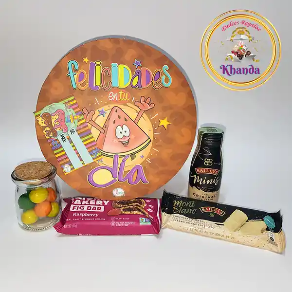Caja Khanda Redonda Selecta, contiene: 1 Mini Botella Crema de Whisky Baileys - 1 Paquete Nature Bakery Fig Bar (Galleta Rellena de Frambuesa) - 1 Barra de Chocolate Mont Blanc 42gr (Chocolate Blanco Edición Especial con relleno sabor crema irlandesa) - 1 Frasco de Vidrio Tapa Corcho Relleno con 9 Chicles Mix de Frutas (Chicles de sabor a frutas variado) - Caja Redonda con Diferentes Motivos.
