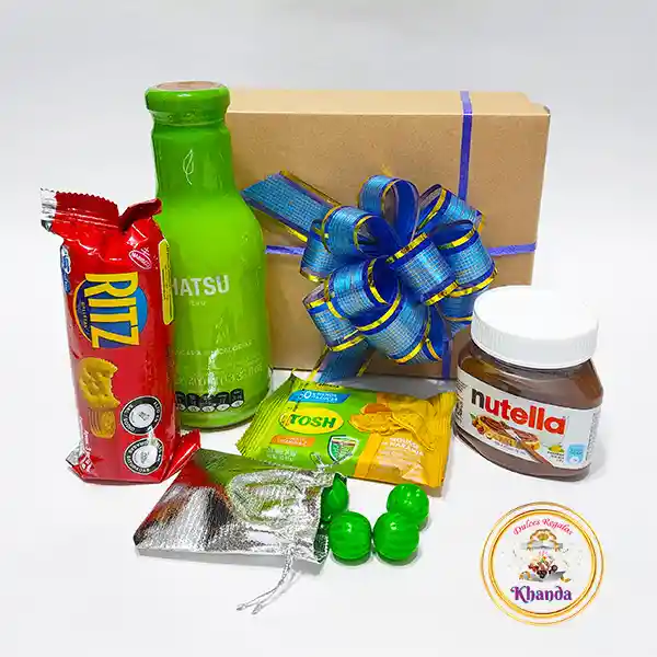 Caja Khanda Regalo Nutella y Galletas, contiene: 1 Tarro pequeño de Nutella x 140gr, 1 Tea Hatsu x 400ml, 1 Taco de Galletas Saladitas Ritz x 58,6gr, 1 Paquete de Galletas Tosh Mouse de Naranja, 7 Chicles Ensalada de Frutas - Caja Ecológica Grande con Moño (Colores Variados).