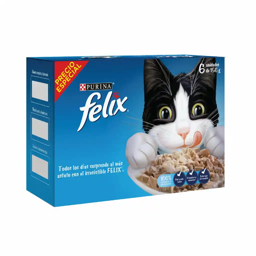 Multipack de alimento húmedo para gato Felix en lata por 156 gramos cada uno, con irresistibles sabores para variar la dieta diaria de tu mascota.