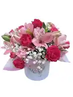 Caja con 10 claveles fucsias , 1 a 2 paquetes astromelia y gypsophila Nota: La flor puede ser sustituida dependiendo la disponibilidad de color y del producto “Mensaje Personalizado” máximo de 30 caracteres (Dejar el mensaje en el chat, los comentarios no se previsualizan para la tienda por lo que si se dejan allí no podrá ser incluido).