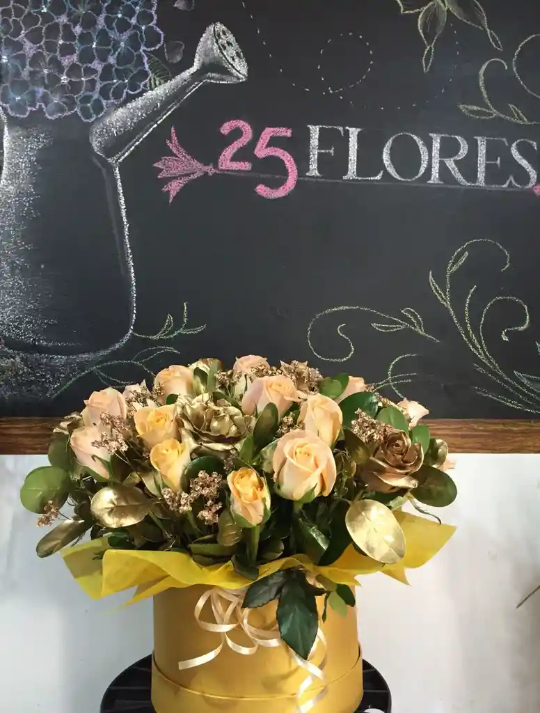 CAJA DE LUJO COLOR DORADA CON 24 ROSAS COLOR NATURAL Y 6 ROSAS PROCESADAS COLOR ORO, ACOMPAÑADAS DE FOLLAGES PROCESADOS Y NATURALES, CON TELAS DE ORGANZA, CINTA RAZO Y TARJETA DEDICATORIA. (Por favor realice su compra con anticipacion, necesitamos minimo de 5 horas para elaborar este producto)