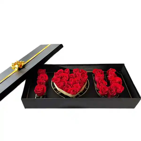 Caja negra con rosas rojas naturales que delinean la palabra " I LOVE U " , ( I love you). Obsequio ideal para sorprender a la persona que amas. La caja incluye cinta y moño dorado para completar el detalle especial. agrega un mensaje dedicatorio
