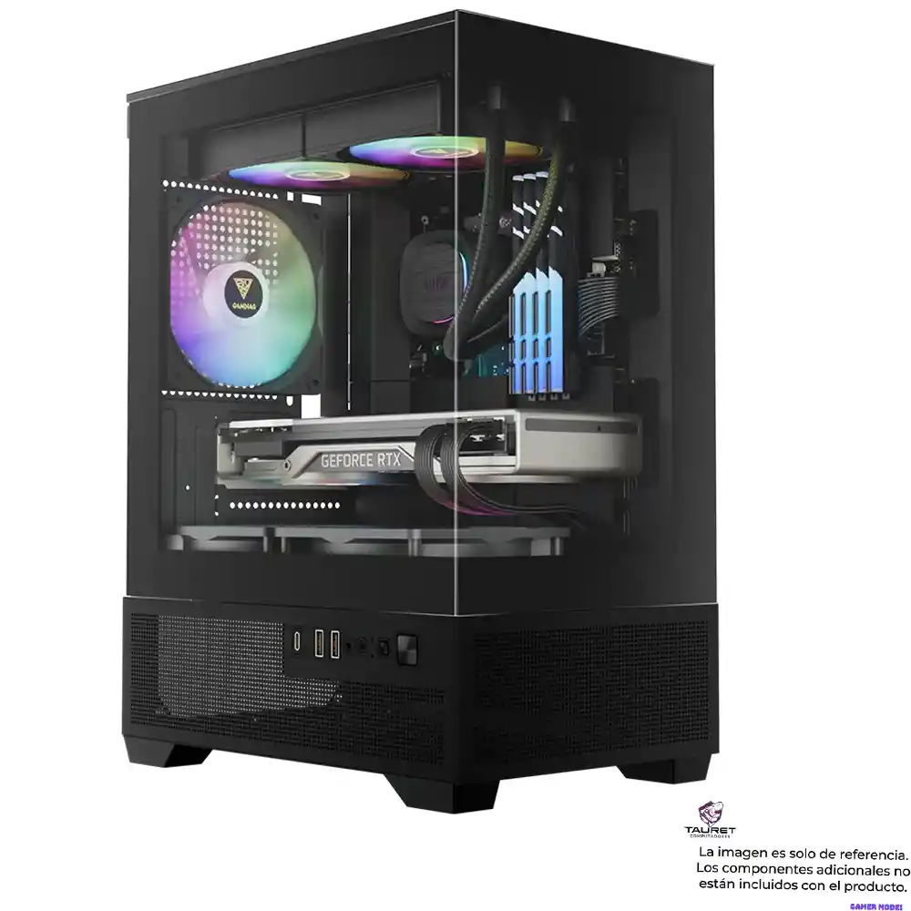 Gamdias AURA GC9M Elite ARGB: Estética Panorámica y Compacta ⚫ El AURA GC9M Elite es un gabinete Micro-Tower diseñado para resaltar el hardware en espacios reducidos. Su estructura con doble panel de vidrio templado y ventiladores ARGB preinstalados ofrece una vista panorámica del sistema, ideal para configuraciones modernas que buscan un equilibrio entre un diseño visual impactante y un flujo de aire eficiente. Diseño Panorámico: Paneles frontales y laterales de vidrio templado que permiten una visualización total y limpia de los componentes. Iluminación de Fábrica: Incluye 3 ventiladores ARGB preinstalados (2 inferiores y 1 trasero) con botón de control de efectos integrado. Conectividad Moderna: Panel frontal equipado con puerto USB Tipo-C de alta velocidad para dispositivos de última generación. Capacidad de Enfriamiento: Soporte para sistemas de refrigeración líquida de hasta 240 mm en la parte superior y disipadores de CPU de hasta 155 mm. Compatibilidad de Gráficas: Espacio interno optimizado para tarjetas de video con una longitud máxima de hasta 280 mm. Garantía: 12 meses