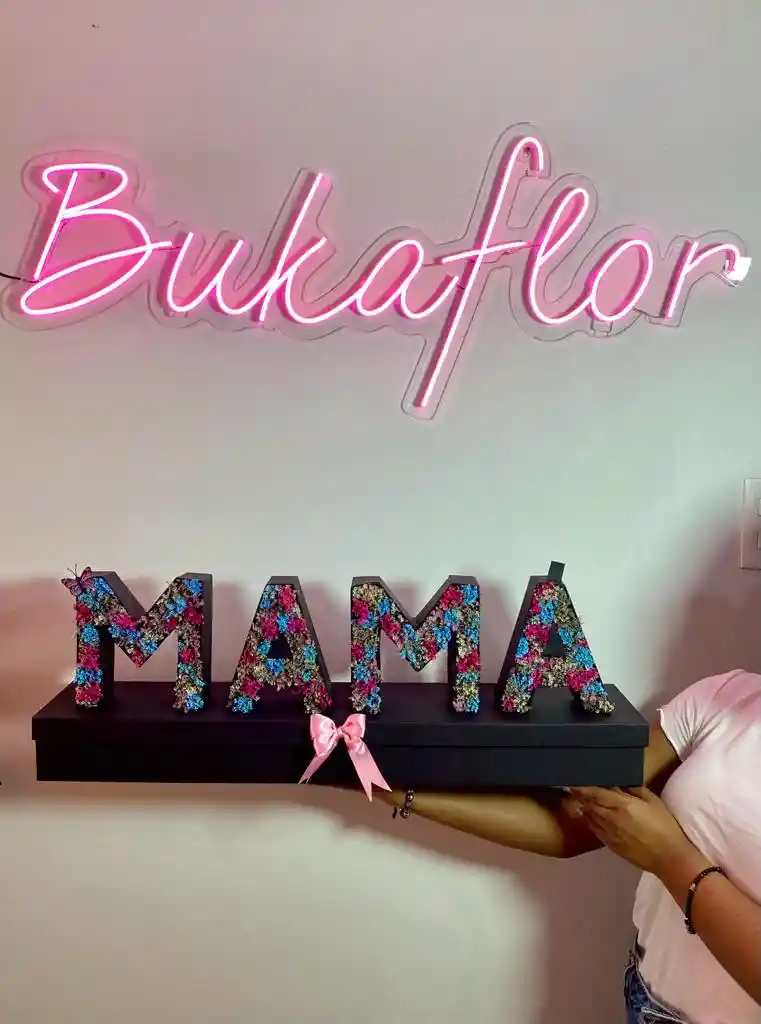 Hermosa y novedosa caja Mamá decorada con follajes naturales (secos) que no requieren agua y perduran por más de 1 año...La palabra Mamá va pegada a la tapa de la caja y dentro de ella encontrará pétalos de rosa acompañados de 2 deliciososo ChocoTeddys (Ositos de chocolate con relleno de arequipe) y 2 cajas de Ferrero Rocher * 4 unidades cada una. INCLUYE: Caja Larga Letras MAMÁ decoradas con follajes inmortalizados. Petalos de rosa 2 ChocoTeddys 2 Cajas de Ferrero Rocher * 4 unidades cada una. 2 Globos de corazón "Feliz día Mamá" inflados con helio. Tarjeta con el mensaje que desees. MEDIDAS: 70 CM Ancho, 23 CM Alto.